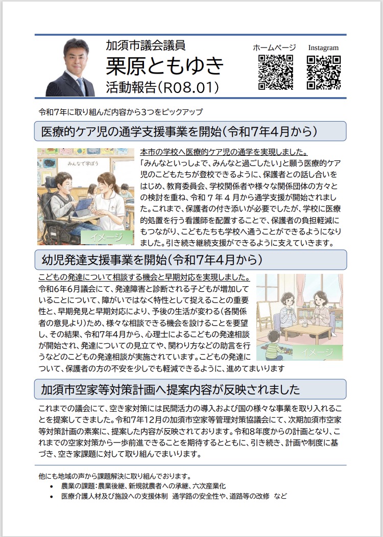 議会で質問や提案した内容に基づき、市と話し合いをして開始された事業等をピックアップしました。市に対し、質問するだけでは無く、情報共有し一緒に考えて行動することにより、事業化することができたのだと思います。